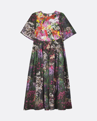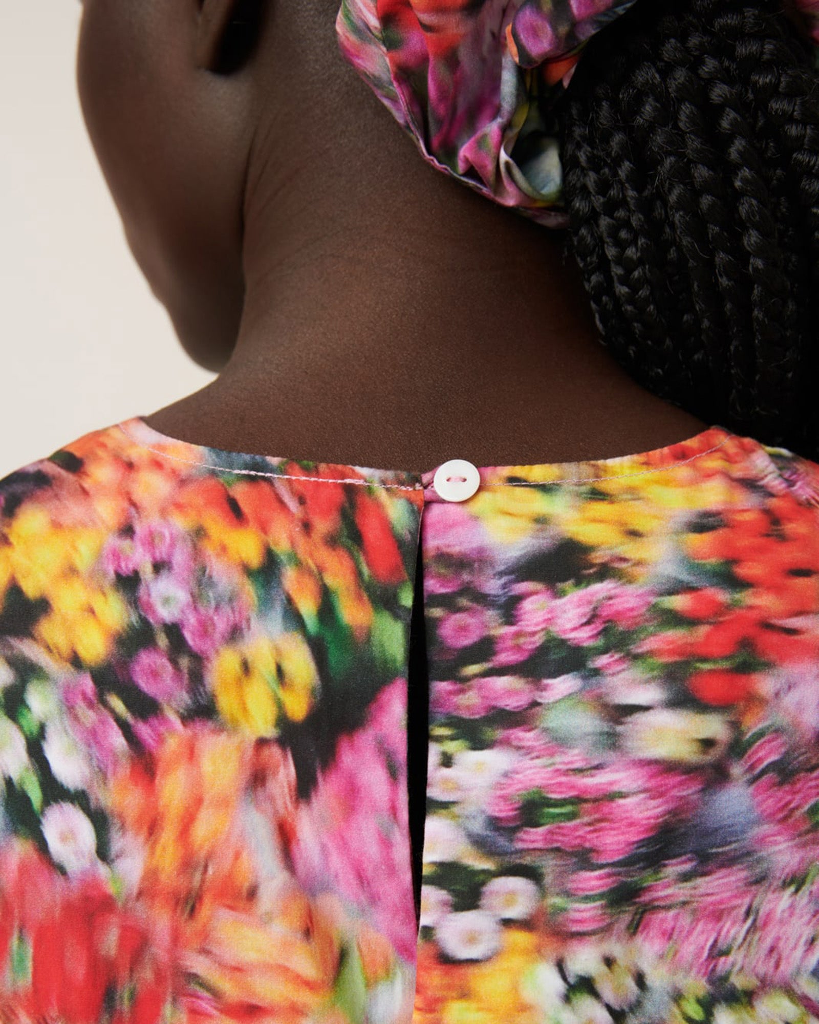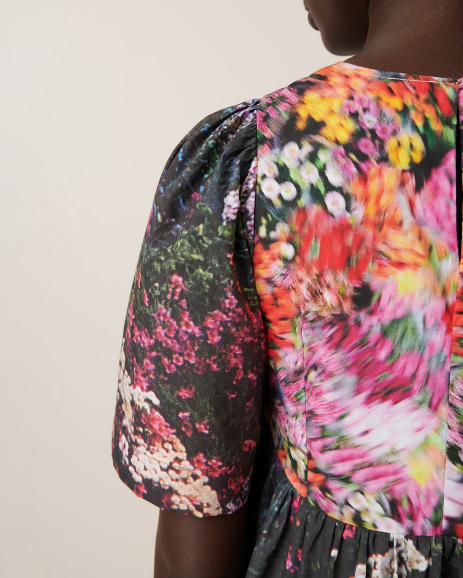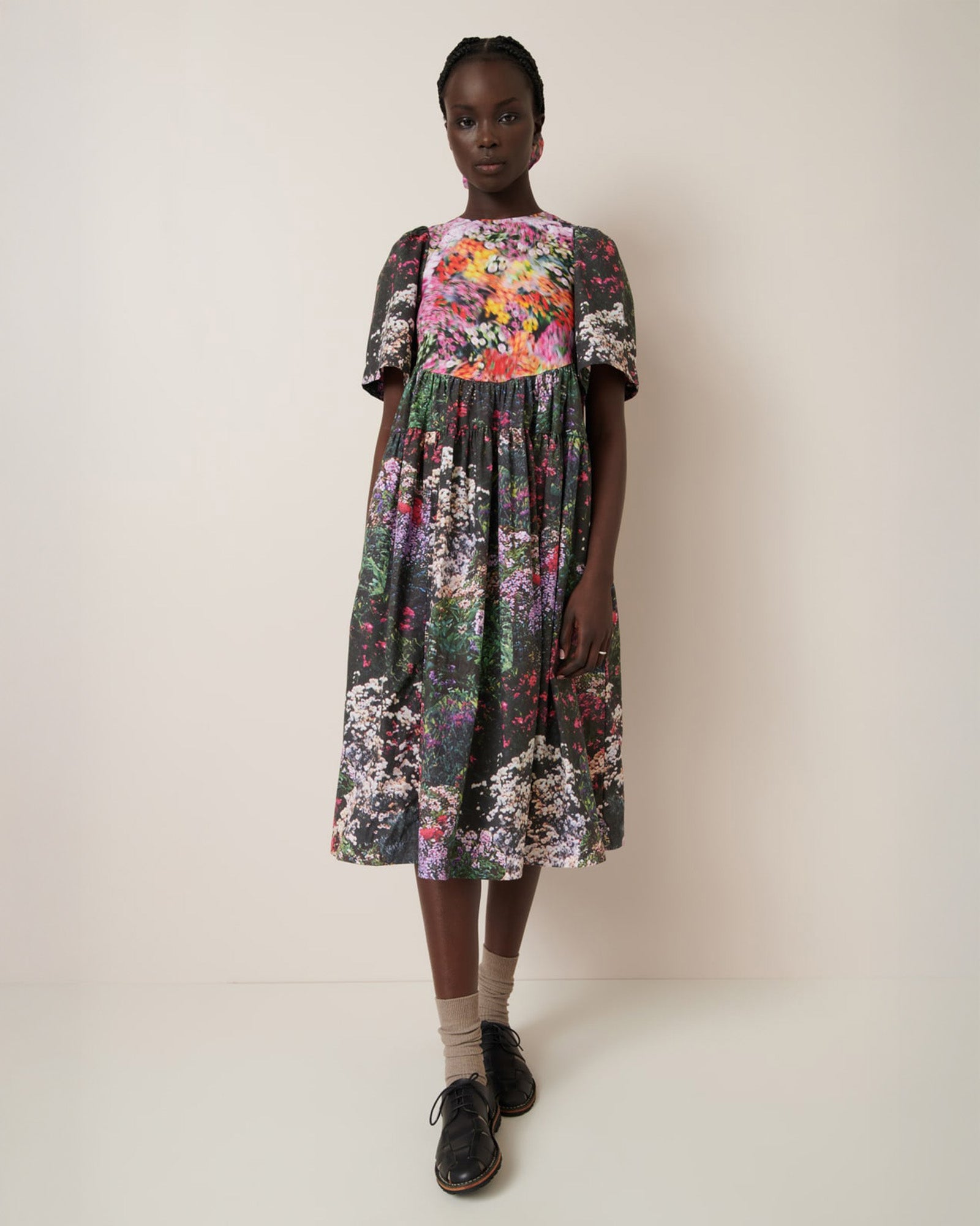 Dress 05 features our archival Garden Book and Hazy Floral prints in organic cotton poplin. It has a full, two tiered gathered skirt with inseam pockets and ends at mid-length. It has puff sleeves and its finished with a key-hole closure with a shell button at the back neck. The dress has a close fit across the bust, and we recommend sizing up 1-2 size in this style for a more comfortable fit.