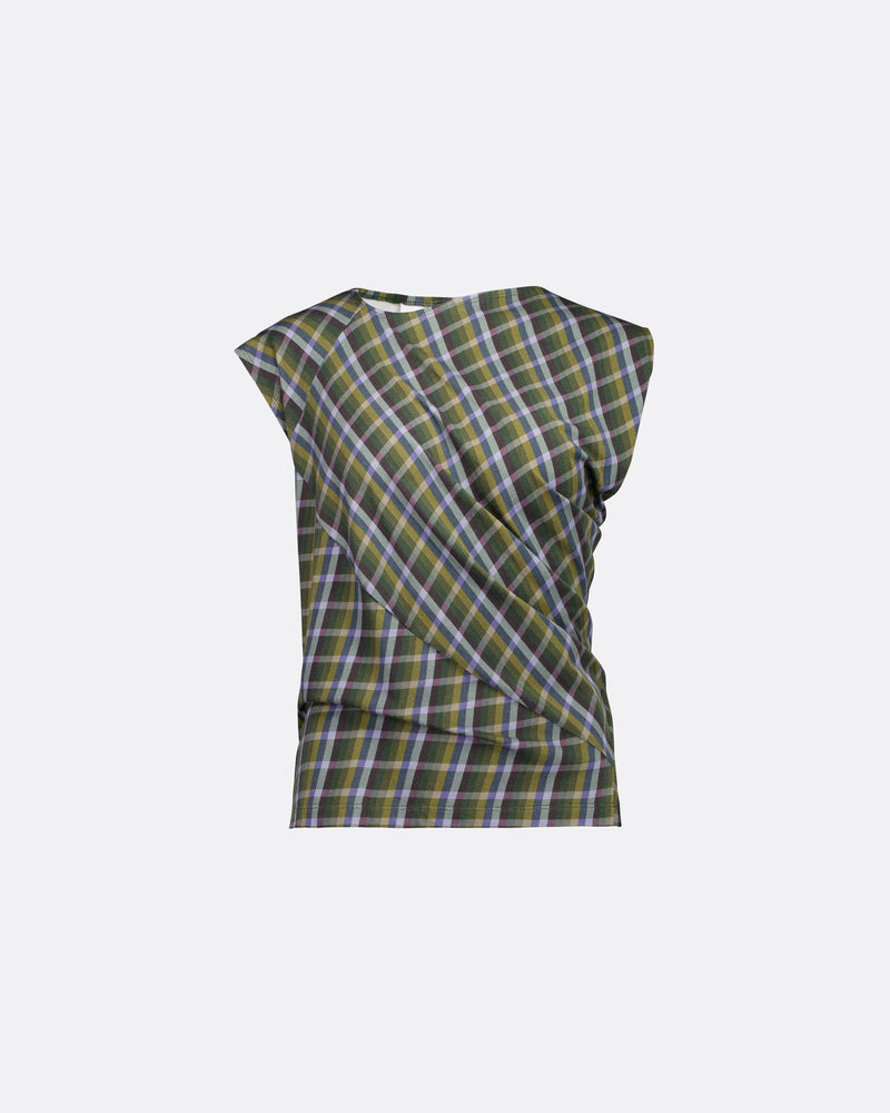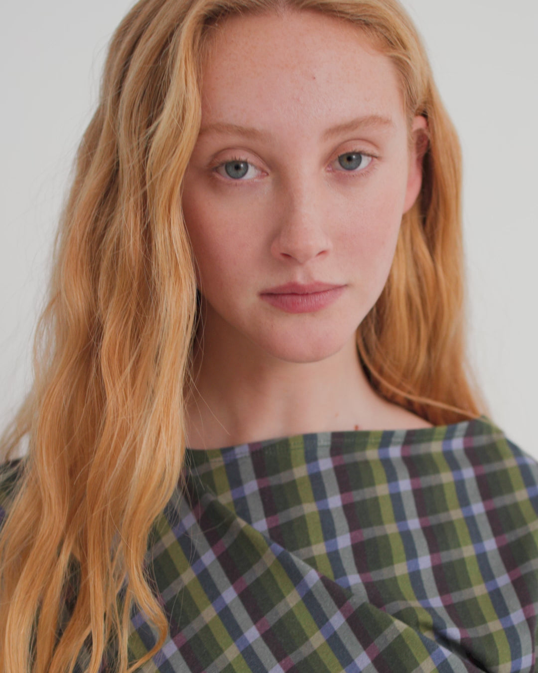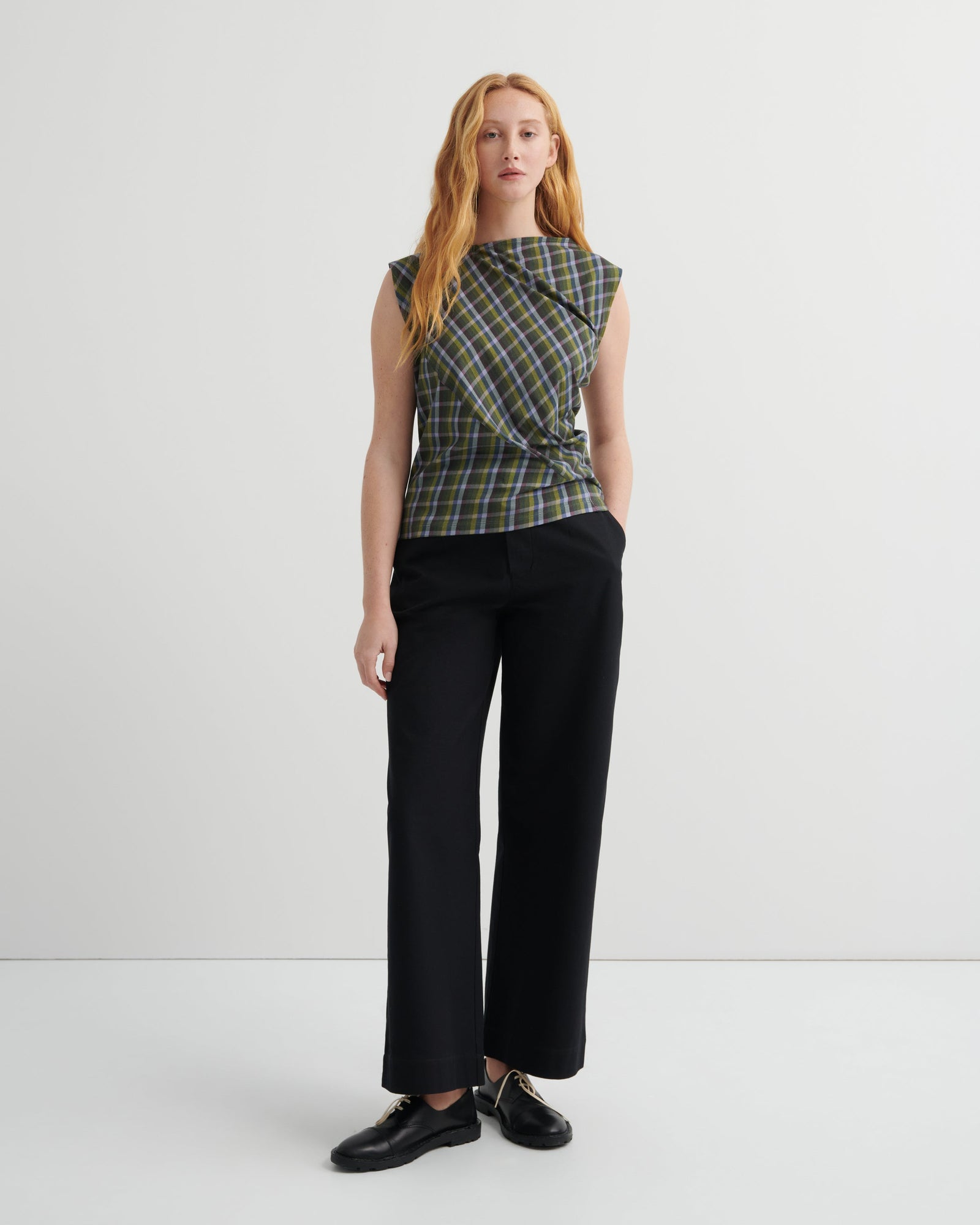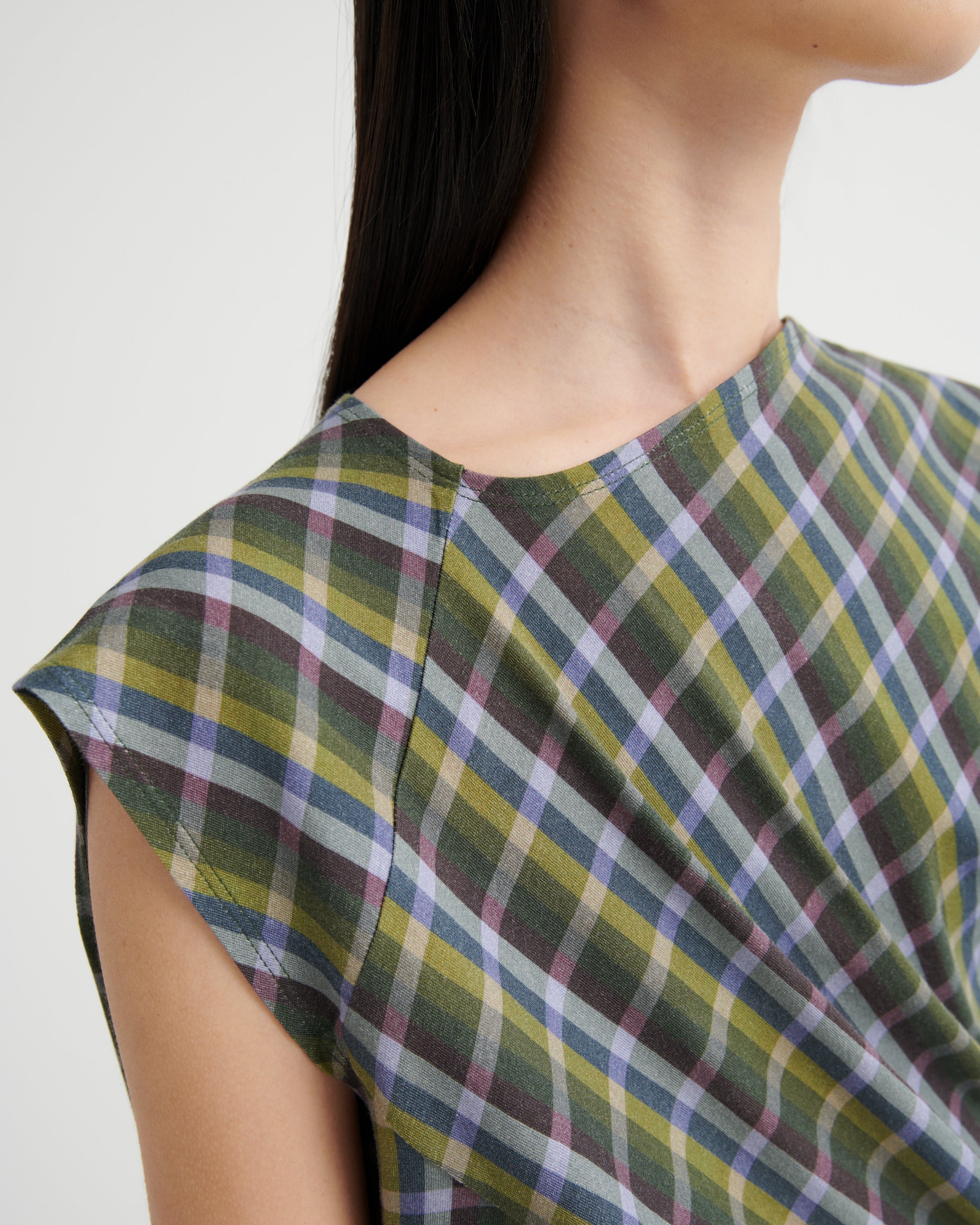 An asymmetric silhouette with a bias-cut front panel that creates a distinctive diagonal drape. It features a standard fit and wide neckline, it’s crafted from midweight organic cotton jersey in Palette Check.