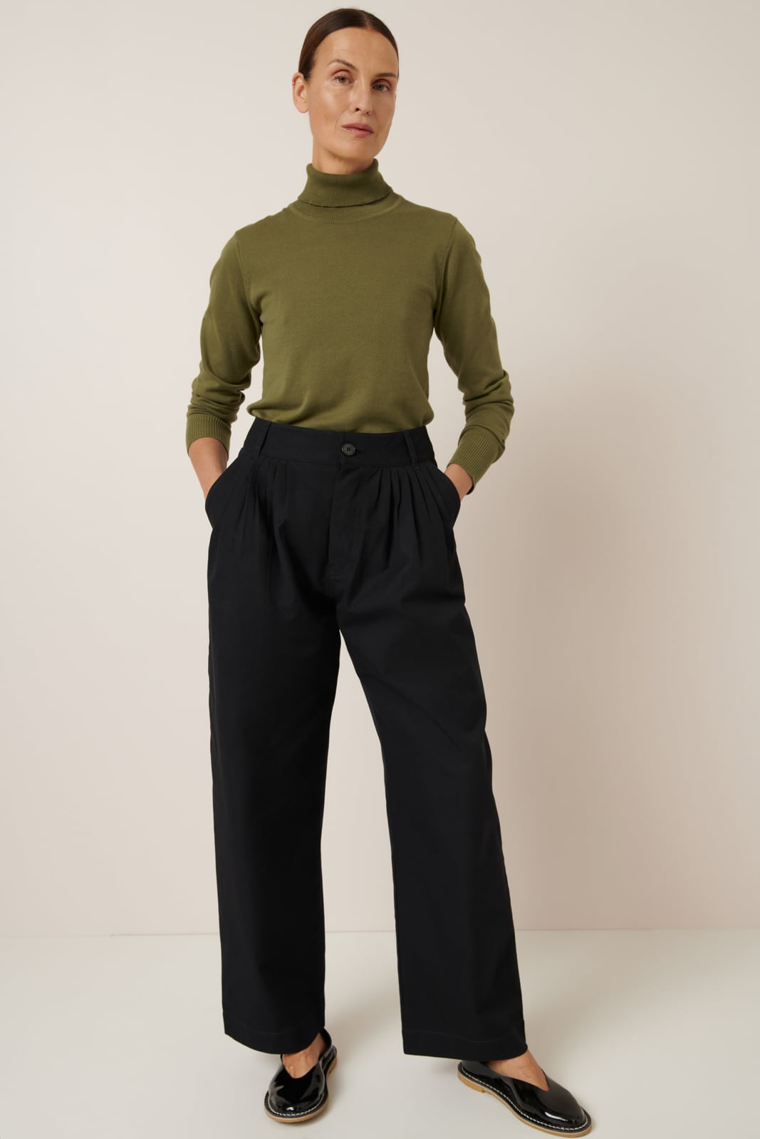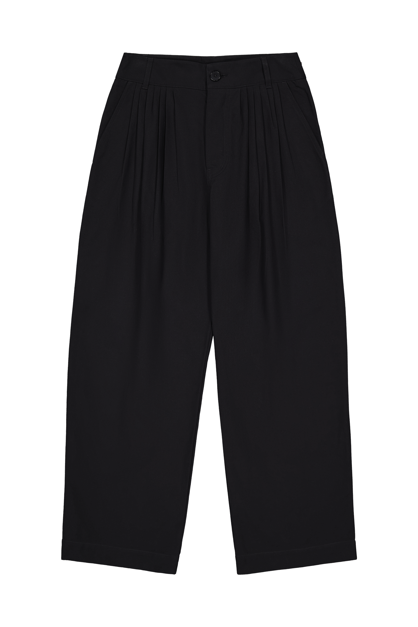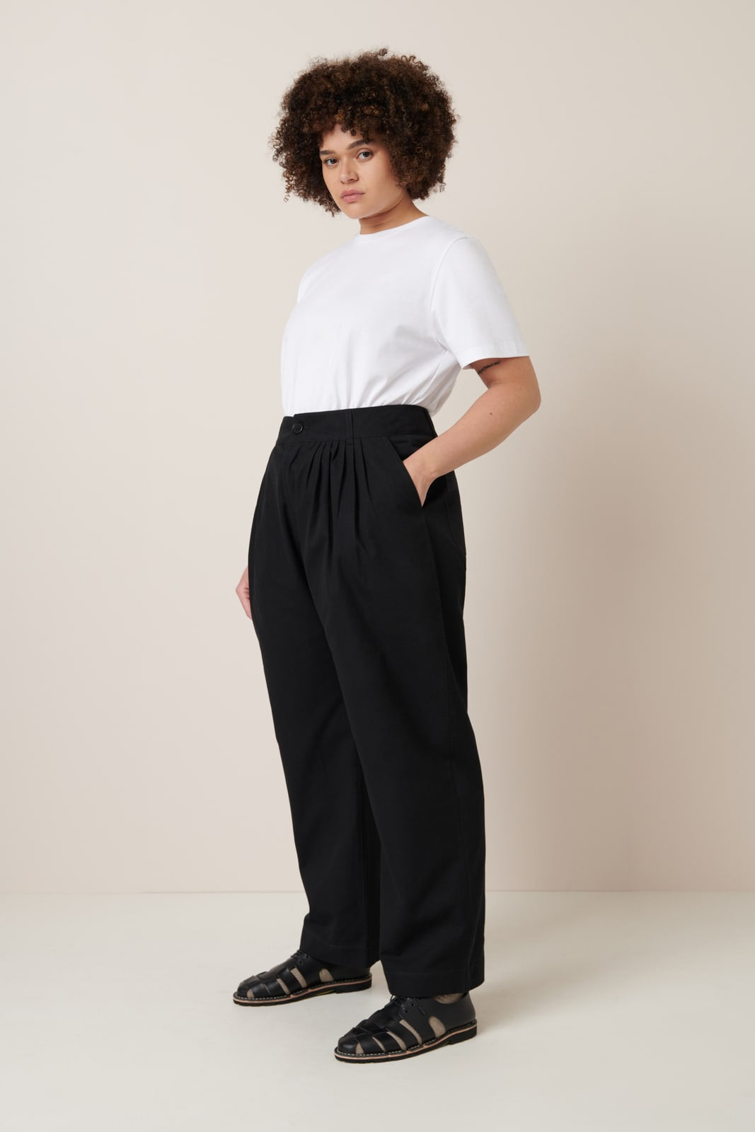 A tailored pant with a relaxed, mid-rise fit with a fixed waistband and nut button fly. The Oliver Pants feature small front pleats which add a sculptural quality to the tapered leg. It has angled front pockets, back patch pockets and is made in a lightweight organic cotton canvas.