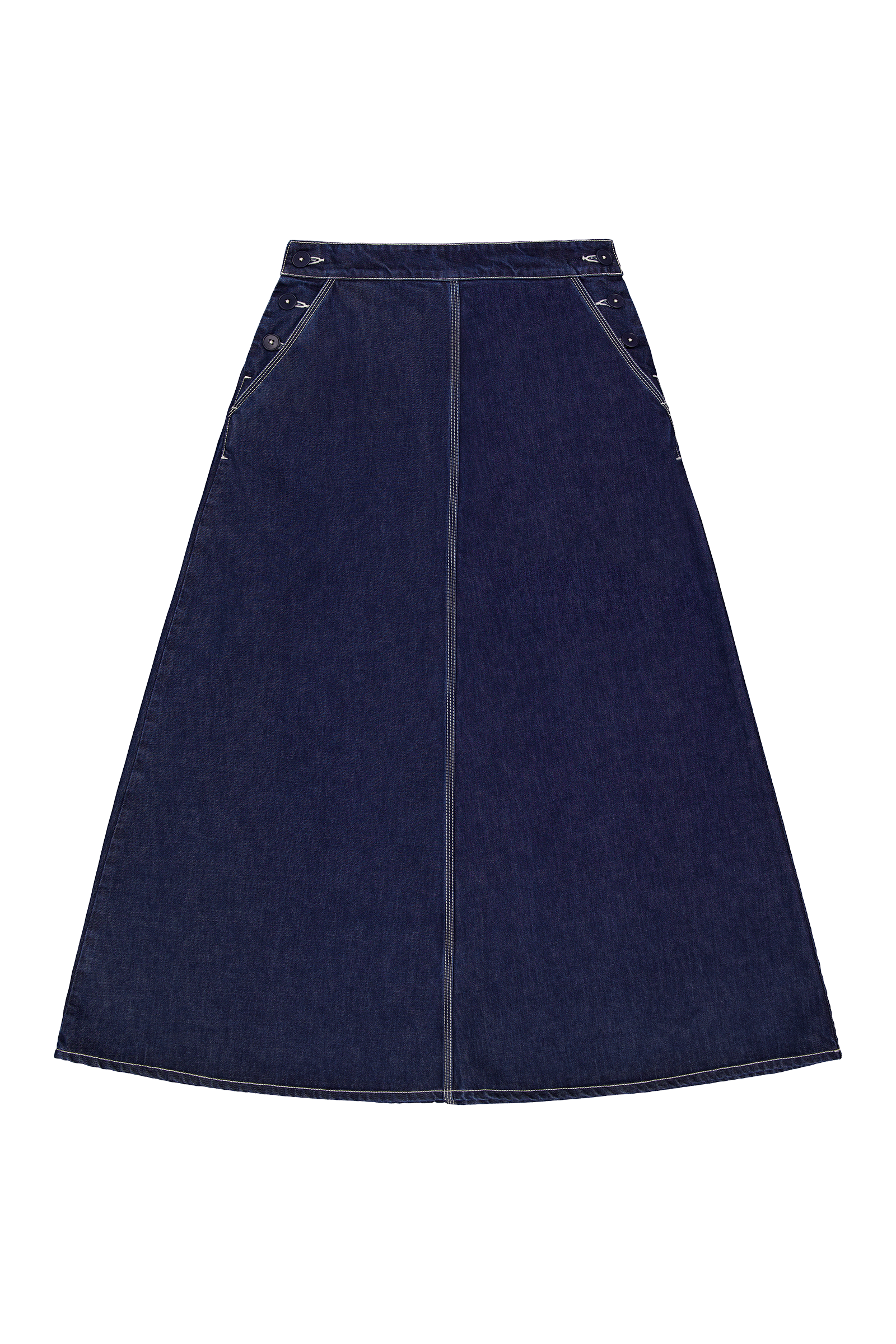 An a-line, full length skirt made in a heavyweight organic cotton denim. The Piper Skirt sits high on the waist with a comfortable partial elastic waistband through the back. It has pockets and opens each side with a Tagua nut button closure.